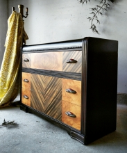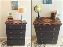 This little dresser is a functional work of art! The base of the dresser was painted in General Finished "Lamp Black", and lightly distressed. It also got a "new" reclaimed wood top, which was hand-stained in a Southwestern design using 4...