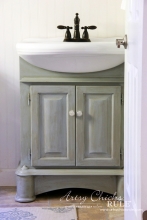 Great bath vanity transformation by Artsy Chicks Rule! It was painted with a custom mix of 1 part GF Snow White and 1 part Persian Blue Milk Paint, glazed with Van Dyke Brown Glaze Effects and sealed with High Performance Topcoat.