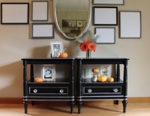 "These 1966 Thomasville night stands came to me with a dated off-white finish and country blue detailing. My client wanted to go big & bold with a Hollywood Regency look and this...