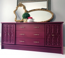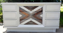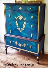 "Layers is what it's all about with this dresser, tearing away at half dried paint with duct tape and sanding to reveal the colours underneath. Using a patterned roller to detail the...