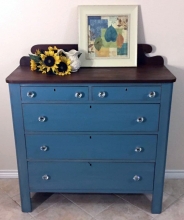 "Cute four drawer dresser painted with GF linen milk paint, stained top using nutmeg gel stain and finished with high performance semi-gloss top coat "
