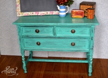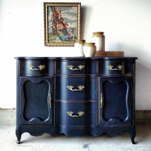 "This buffet was finished in a deep indigo blue that I mixed using Klein Blue and a bit of Lamp Black GF Milk Paint. The end result was a sophisticated blue that enhances the beautiful shape of this vintage piece. It was distressed then sealed...