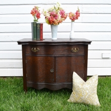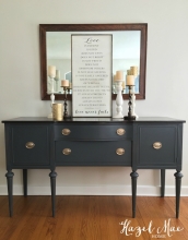 This classic Hepplewhite buffet was redesigned in a deep, rich gray - Queenstown Gray Milk Paint by General Finishes. I have been trying out this line of paint and have been very happy with how it goes on and distresses. I rubbed back the paint...