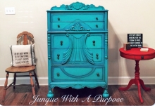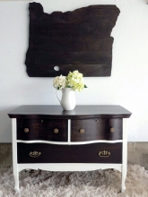 This dresser was given a complete overhaul! It was thoroughly sanded down and cleaned. The side drawers and body were painted in General Finishes Milk Paint, in Seagull Gray...