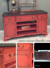 "We converted this gorgeous buffet to an entertainment console. Drawers were reconfigured and adjustable shelving added for maximum storage. Finished in General Finishes Persimmon with General Finishes Van Dyke Brown and Pitch Black Glaze The top...