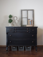 "Empire dresser painted in Lamp Black, distressed, and sealed with HPTC Satin. Original wooden knob with Lamp Black sanded back to show more of the natural wood."