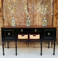 "This buffet had layers of paint when I revieved it. LAYERS!!! You can see in the areas that are distressed the different colors. I painted it in Lamp Black and then Antique White. I...