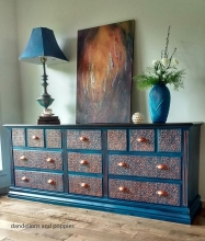 "A pretty mundane 9 drawer dresser. Painted in Coastal Blue milk paint and a little white mixed in here and there. A raised stencil applied with drywall compound and...