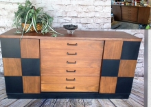 This unique vintage buffet was refinished with a custom mix of Antique Walnut & Georgian Cherry Gel Stain as well as Lamp Black Milk Paint by Restyle & Renew