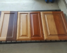 "There's nothing like a good before and after! A peek at some stain samples we did in preparation for our most recent vendor fair. Far left: General Finishes Espresso, Middle & Far Right: 2 variations of General Finishes Black Cherry."
