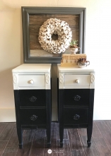 "How fun is this nightstand set?! Done in a black and white color block for a fresh modern farmhouse vibe. Finished on the back so you can use them as end tables as well. " Reclaim + Relove