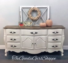Classic and timeless dresser in GF Antique White Milk Paint by The Goodie Girl Shoppe. This would look great in any room!