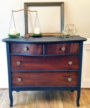 "This antique walnut chest of drawers was refinished in General Finishes Gel Stain color, Java. The body was painted in Heirloom Traditions Paint color, Privilege. The middle drawers was decoupaged with a beautiful Black-capped Chickadee theme...