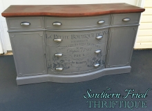 "Exquisite Duncan Phyfe style buffet with six drawers and two doors with shelves. Refinished in General Finishes Driftwood grey and restained mahogany buffet top. New hardware in oil rubbed bronze. Features a gorgeous and detailed IOD transfer we...