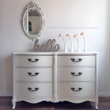 "Classic and simple. Very fresh and clean. French Provincial is not something I buy a lot of but this one spoke to me. It is painted in General Finishes Antique White. " - Katie & Co. Furniture Restorations