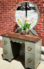"Hello to this cutie! Transforming old sewing desks is not really my thing, but this had great bones, so I dove in. This great, solid accent table is painted with General Finishes Patina Green, Queenstown Gray, & sealed with High Performance...