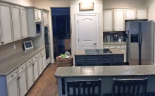 The cabinets were painted with GF Antique White Milk Paint, accented with Van Dyke Brown Glaze Effects and sealed with High Performance Topcoat.