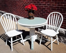 "This solid oak table and chairs was found on the side of the road by my Man Friend, who smartly loaded it up! The set has hints of General Finishes Basil Milk Paint & Bayberry Chalk Style Paint peeking through a finish of General Finishes...