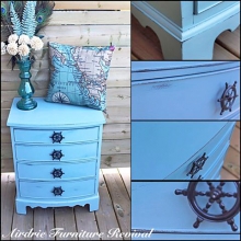 Airdrie Furniture Revival of Airdrie Alberta gave this nightstand a nautical makeover with General Finishes Persian Blue Milk Paint and those awesome ship wheel knobs!