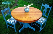 Karin of Art is Beauty says " I chose General Finishes Charleton Blue (Chalk Style Paint) for the base of the table and the chairs. I had picked up this pretty fabric for another project...