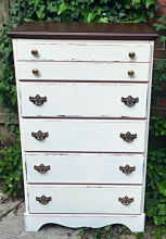 This vintage Carolina chest of drawers was given a fresh look with General Finishes Linen Milk Paint and Java Gel Stain by Reclaimed Karma. Love the distressing!