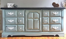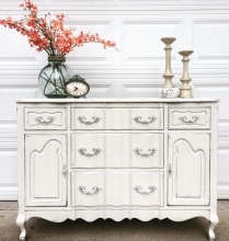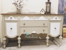"Beautifully detailed 100 year old buffet got a makeover in Antique White and Millstone Milk Paint with an Antique Walnut (Gel Stain) top. Thanks General Finishes!