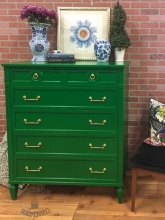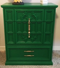 "Garage 9 painted this vintage, Bassett chest of drawers, as a custom job for a client. GF Milk Paint in Emerald Green and sealed with HPTC in Flat. The original hardware was spray painted metallic gold. Emerald Green was a fabulous color choice for...