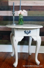 Number Fifty-Three refreshed this vintage end table with GF Linen Milk Paint and a charming chandelier stencil in Driftwood.