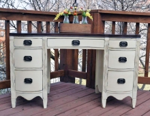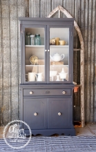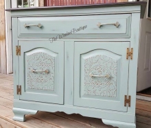 "This piece was done exclusively with General Finishes products. The body is GF Persian Blue Milk Paint ...a soft dusty shade of blue and the top is GF Java Gel Stain giving it a rich dark finish. The entire piece is protected from wear and tear...