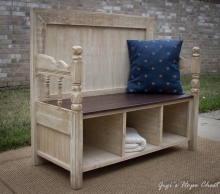 "We completed this custom bench for a client this afternoon! We always enjoy repurposing (headboard) to create a more useful piece. We absolutely love the finish on the bench. It has been painted with Antique White Milk Paint, then Van Dyke Brown...