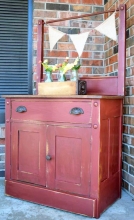 We absolutely adore this refinished dry sink in GF Tuscan Red Milk Paint by Shannon of Refurbished by Sweet Threepeats!