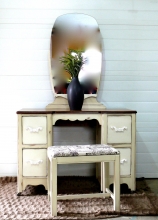 We're loving this upcycled vanity by Dressers and Jujubes made with Linen on the shell and Antique White on the drawers and the top is stained in Candlelite Gel Stain. Finally, everything is sealed in High Performance Top Coat.